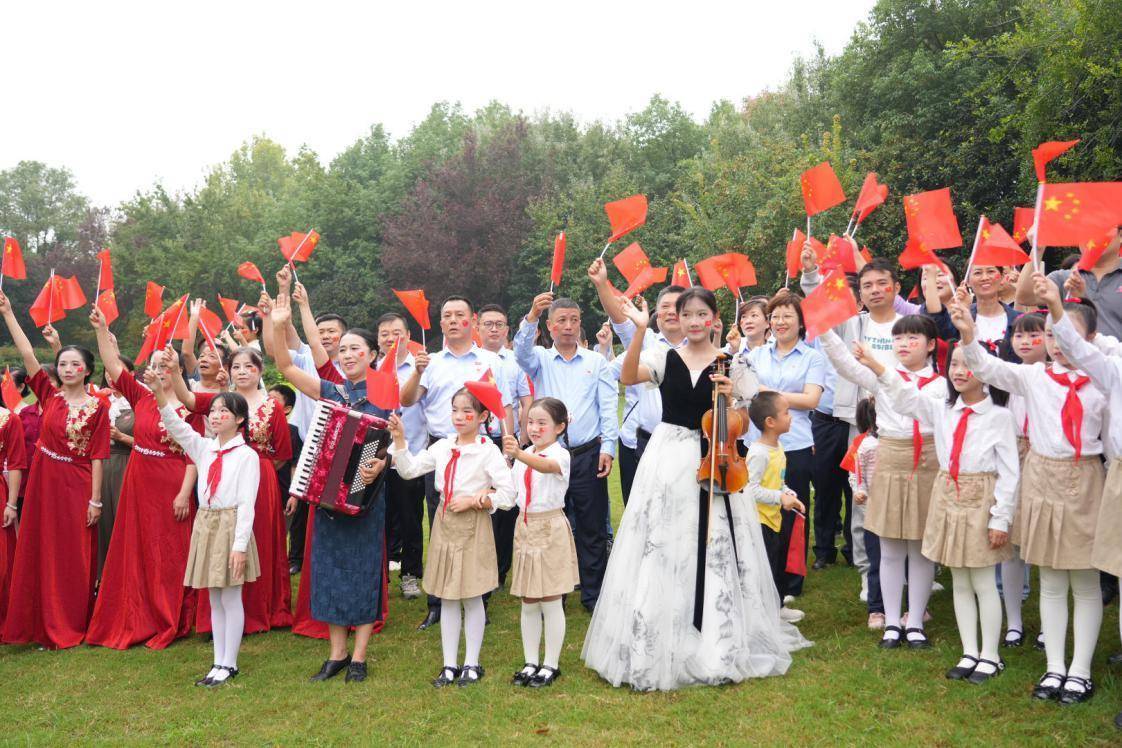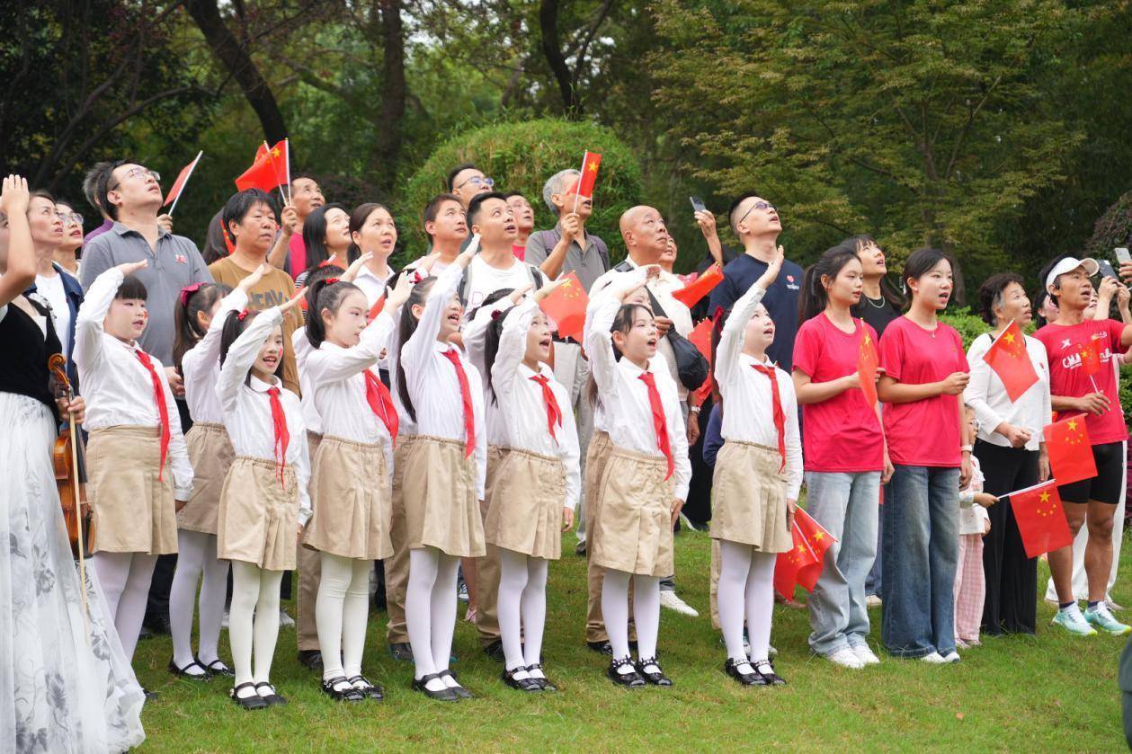 “我和我的祖国,一刻也不能分割……”当管弦乐团奏响熟悉的旋律,在专业领唱的引领和感染下,游客们不约而同地挥舞着手中的红旗,共同歌唱祖国。现场志愿者们穿梭在人群中,热情地向游客发放国旗和国庆主题脸贴,吸引更多人加入合唱队伍。